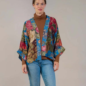 Inspired by the Dutch Old Masters. A blooming bouquet of primroses, auriculas, and polyanthus flowers in a stunning range of bold colors. This charming kimono is made of a custom blend of cupro and modal which creates a silky smooth lightweight material while having a more sustainable impact on the environment. This short kimono jacket is waist length complete with wide 3/4 length sleeves and can be worn for any occasion, whether you pair it with a neutral cami or layer it over a little black dress they can make the perfect addition to your outfit . Kimonos come in one generous size but have been made to look flattering on all body shapes. One size fits most. Hand wash cold, cool iron, do not tuble dry. Measures 27 x 24.5 in.