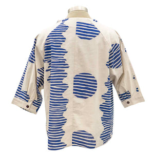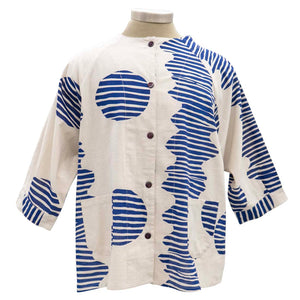 Charming striped scoop necked button down shirt with two front pockets and three quarter length sleeves. Mona Lisa – designed in Japan by Natsuko Eriguchi features fun loving, creative, and free flowing fabrics with exceptional prints for the woman who loves life. This collection includes vibrant and sophisticated prints, creatively constructed with various fabrics such as batik, and hand-woven, painted and printed fabrics. Crafted from 100% cotton – light to heavy weight, and fleece. Made in India. Measures 24 long x 26 wide in. flat.