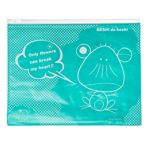 This exclusive pouch features Beshi, a laid-back, observant frog who lives under a drainpipe with his quirky companions—Nyarome, the alley cat and Kemunpas, the elderly caterpillar. Beshi now serves as the official mascot of Art of Manga, the groundbreaking exhibition organized by the de Young museum located in San Francisco's Golden Gate Park. Regarded as a pioneer of gag manga, creator Akatsuka Fujio created the beloved character Beshi from his noted manga Mōretsu Atarō. Produced by Tokyo-based Fujio Productions, this plastic zip pouch can hold items separate, making them easy to find in a large bag. Made in Japan. Measures 10 x 7.5 in. Made in Japan. Measures 10 x 7.5 in.