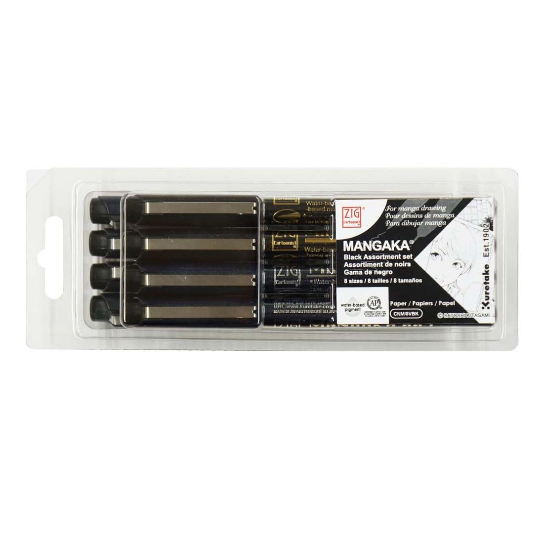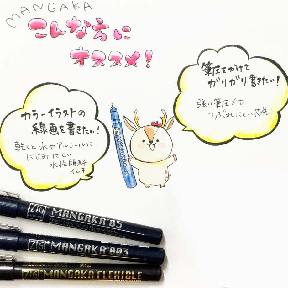 A line drawing pen that is perfect for drawing lines of manga and illustrations. Set of 8 Black includes 6 types of "MANGAKA" with a hard core and 2 types of "MANGAKA FLEXIBLE" that draws a soft, weak line. Will not bleed through dry surface with alcohol-based markers. Pens measure 0.4 x 0.4 x 5.5 in.