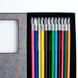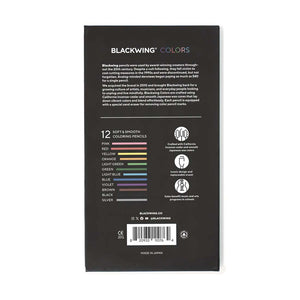 Blackwing Colors were designed specifically for coloring. Each pencil is made with genuine incense-cedar and includes a unique soft and smooth Japanese wax color core. Each pencil features the same semi-hexagonal barrel and iconic ferrule found in our graphite pencils. The design also features a special sand eraser with a semi-abrasive texture made specifically to erase colored pencils. Each set includes 12 colors: Pink, Red, Yellow, Orange, Light Green, Green, Light Blue, Blue, Violet, Brown, Black, and Silver.Set of 12 colors.