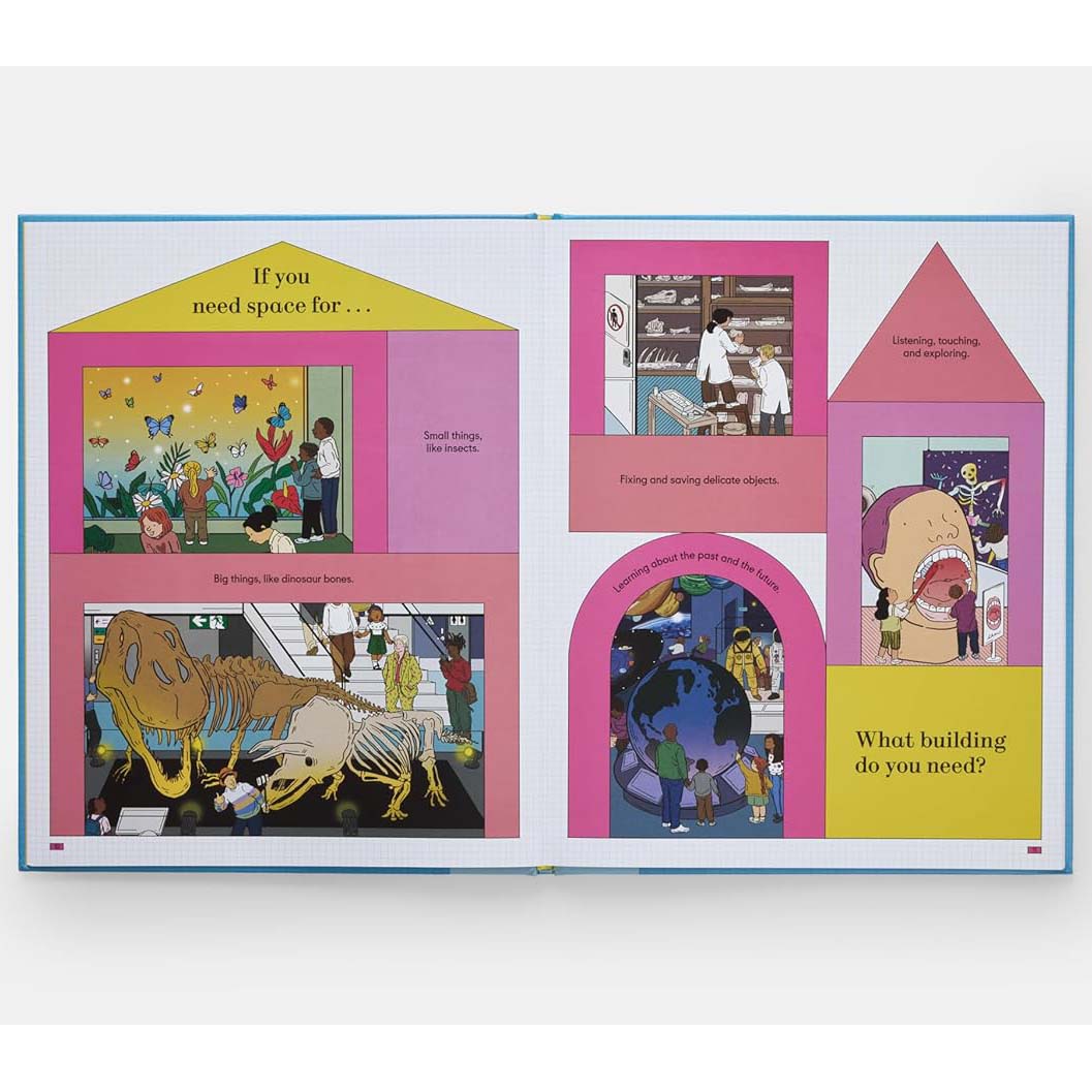 In this interactive first book of architecture, children discover how architects design everyday buildings, from planetariums, aquariums, and airports to supermarkets and shopping malls, so that they best meet their users’ needs. Set up as a guessing game, the book presents clues that invite readers to guess which type of building is needed in 10 different scenarios. For example, what building do you need for students, teachers, and learning about science, history, and art? A school! Children continue the fun by looking for the hidden architect on each spread.