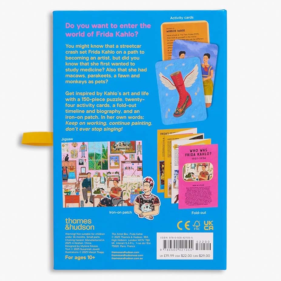 Piece together the 150-piece jigsaw puzzle of Frida’s studio in her Casa Azul home in Mexico City, and spot five of her paintings, two of her lovers, and seven of her pets. Make a style statement by ironing Frida’s patch onto your favorite tote bag, shirt, or jacket. Celebrate living boldly like Frida! Ages 8 to 12. Box measures 5.7 x 2 x 8.6 in.