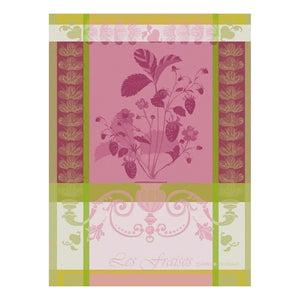 Enjoy a dash of strawberries in your kitchen with the Fraisier Rose towel, in pink, green, and white hues. This jacquard towel is crafted for both aesthetic charm and durability, ensuring long-lasting use. To care: Wash separately before the first use (95ºF – warm temperature). Machine wash (between 95ºF and 140ºF – warm temperature) with a color safe detergent. Tumble dry on medium setting. Iron on high setting on the back side. 100% cotton. Made in France. Measures 22 x 30 in.