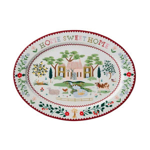 Serve hors d'oeuvres or family-style dishes on this elegant porcelain tray, featuring charming farm illustrations and cross stitch-inspired details, metallic gold accents, and a gold painted edge. Full color illustration. Hand wash only. Not microwave safe. Measures 15 x 11.25 in.