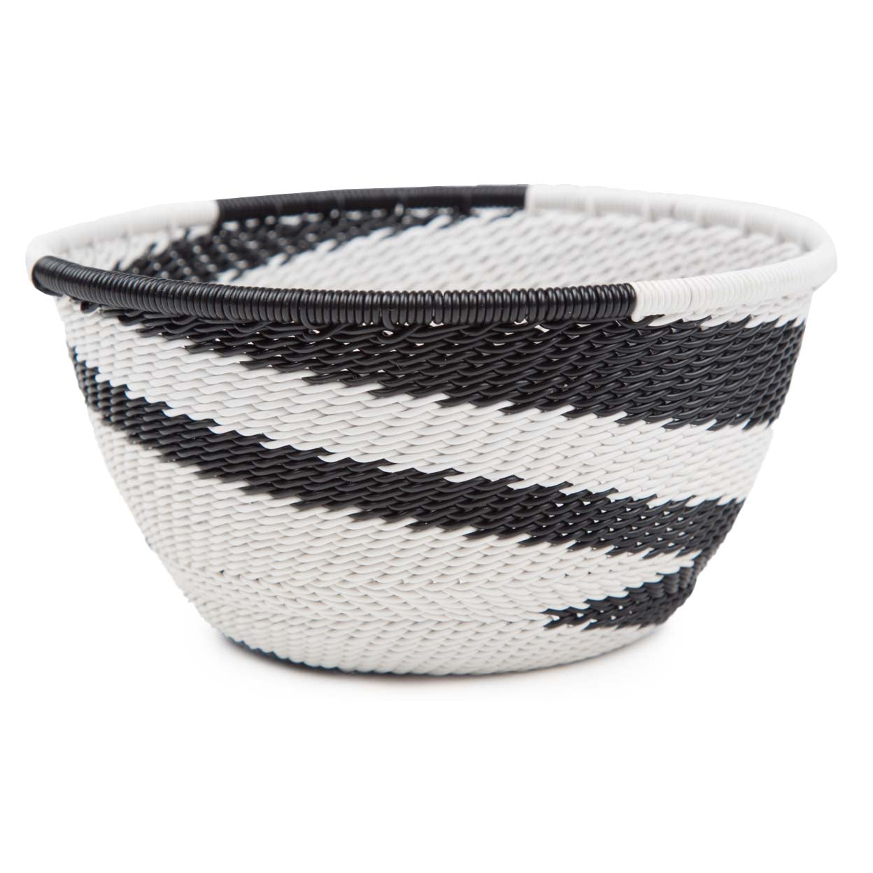 Enjoy this charming black and white small bowl, perfect for home decor and can hold food with a liner. Hand made from telephone wire. Each design is unqiue and will vary slightly. Can be washed with warm water and soap. The Zulu people of South Africa combine traditional weaving skills with contemporary design to create beautiful products and earn an income to support their families. Made in Africa. Measures 4.5 x 2 in.