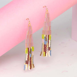 Lightweight, colorful, and unique, these handwoven elegant Japanese Miyuki glass beaded earrings combine woven tubular beads for the upper portion with classic smaller beads for contrast in the fringe. Beautiful bead colors including gold for a touch of shimmer make up abstract lines throughout the fringe. These earrings are handwoven by talented women artisans in Medellin, Colombia who receive fair working conditions and compensation for their skills. Measures 3 x .5 in.