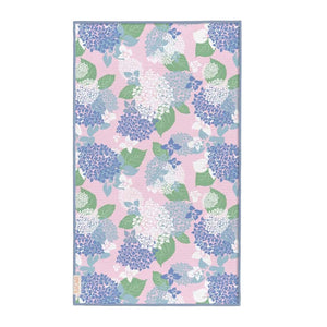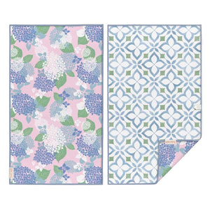 A reversible microfiber towel showing beautiful, stylized hydrangeas and a playful graphic on the other.  Hands down, these high-performance, eco-friendly microfiber towels are clean-up marvels. An optimized, waffle weave material blend makes these towels ultra-absorbent and quick drying. And that’s not the half of it. Each reversible towel has not only one but two gorgeous works of art to brighten your workspace, not to mention your mood. Full coverage print on both sides. Sewn in loop for hanging. Machine washable, tumble dry low, keep away from high heat. Measures 18 x 30 in.