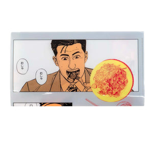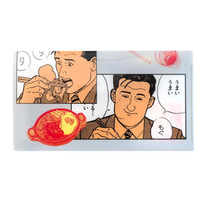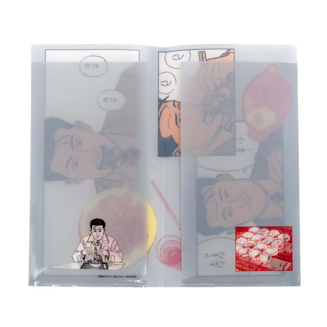 Featuring details from Taniguchi Jiro's manga, The Solitary Gourmet, a slice of life manga focusing on dining and food, this thin plastic folder was created exclusively for Art of Manga, the groundbreaking exhibition organized by the de Young museum located in San Francisco's Golden Gate Park. Perfect to use to hold and transport important papers, this thin plastic folder open up to feature two pockets and is a unique keepsake from the exhibition. Made in Japan. Measures 4.75 x 8 in. closed. 9 x 8 in. open.