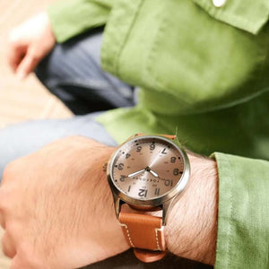 The Mason watch collection has an IP plated full numbered dial and a brushed surface to creating a reflective look. The plating color continues from the dial onto the casing for a clean, bold styling. Luminous hour and minute hands feature alongside a slender second hand with red pointer. A thick Italian leather watch band is finished with linen top stitching. The sophisticated yet sporty design can easily be dressed up or down for any occasion. Movement is battery operated Japanese quartz. Case size measures 45 mm. Watch length measures 8.5 in.