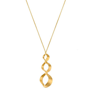 Golden necklace with a triple pendant of convex and concave shapes that captures the mirage of a moving dune landscape. Made of brass with 24K gold-plating. Long chain, without closure. Joidart is a family jewelry business based in Barcelona, Spain started by Jaume Julià  in a small metalsmith shop in 1981. They make their jewelry conscientiously and locally, through processes that are as environmentally friendly as possible and produce all the pieces by hand in short runs. Utilizing artisanal jewelry-making techniques and following the Slow Crafts methodology, each manual process – soldering, polishing, scratching, enameling – is carried out calmly, allowing the jewelry the necessary time to achieve the desired finish. The charm of Barcelona inspires the jewelry and mirrors the creative spirit of the city. Measures 31 in.