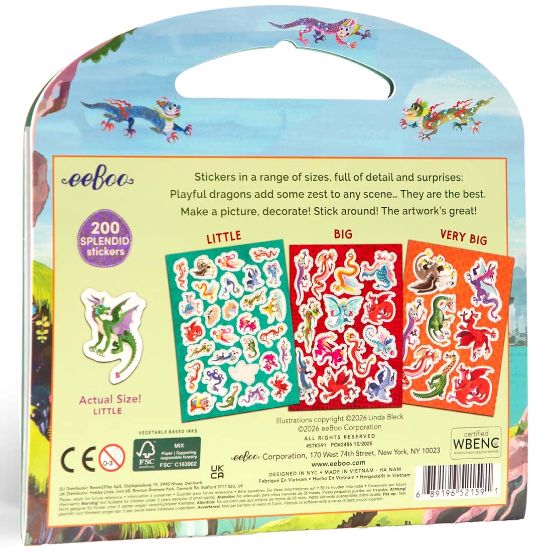This colorful array of dragon stickers in 3 sizes will inspire imaginative sticker-play for all ages. Featuring cheerful and vibrant illustrations by artist Linda Bleck. Promotes Screen-Free, Self-Directed, Imaginative Activity. Includes three sticker sizes: Little, Big, and Very Big. Sustainably Sourced: Made with recycled board and printed on FSC®-certified paper using vegetable-based inks. Measures 8 x 8 in.