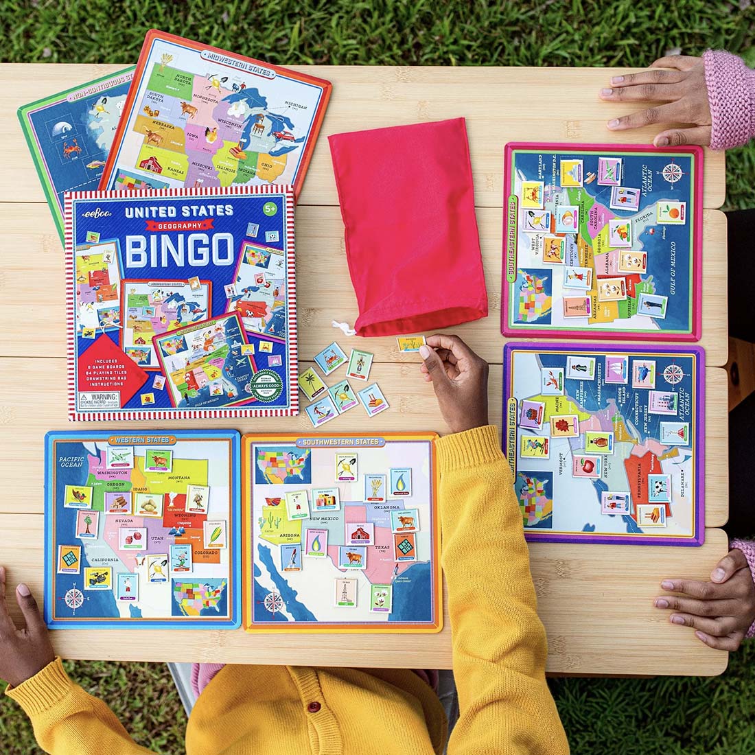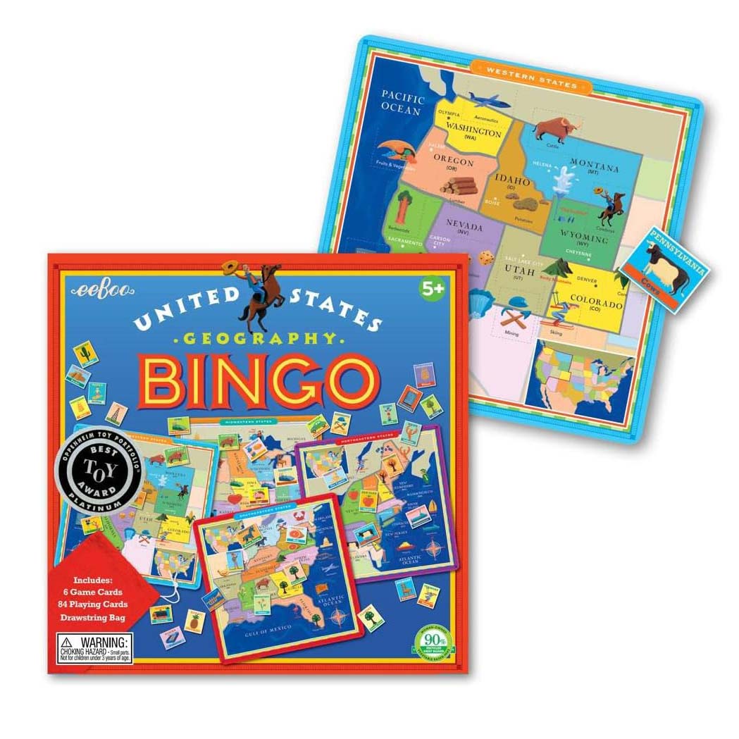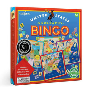 A classic Bingo game featuring the geography of the United States. Each Bingo card represents a different region of the USA, along with icons symbolizing key industries, wildlife, and features associated with each state. Additional information about the states can be found on the back of each card. All elements are thoughtfully and carefully illustrated by Uta Krogmann. Ages 5 and up. Measures 8.25 x 8.25 in.