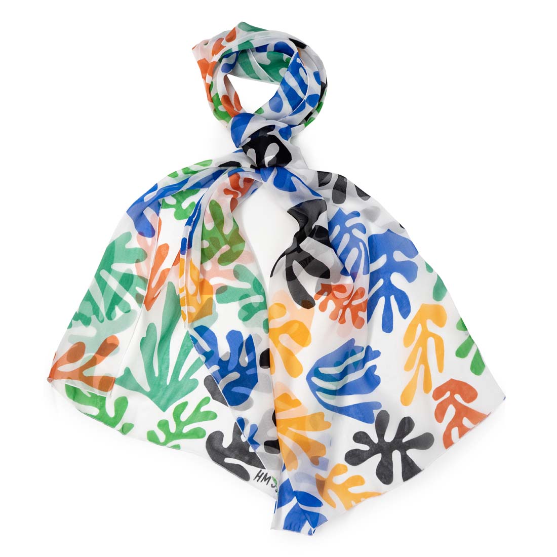 Bring home a piece of Matisse’s Jazz Unbound exhibition, on view at the de Young museum located in San Francisco's Golden Gate Park. This charming silk scarf is inspired by Henri Matisse's iconic artwork Algues, 1947. This 100% silk chiffon scarf is expertly made in France. Dry clean only. Measures 15 x 56 in.