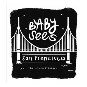 A high-contrast board book designed for babies’ developing eyes by artist Janna Steagall, with regional focus on San Francisco. Baby sees a bridge. Baby sees a pier. Baby sees bread. Created for the youngest readers and their developing eyes, this high-contrast board book explores the sights of the City by the Bay, including sea lions, and more! With simple text but clearly recognizable images and patterns by Janna Steagall, Baby Sees San Francisco is the perfect tummy time companion for babies born in or visiting San Francisco. Board book, 16 pages.
