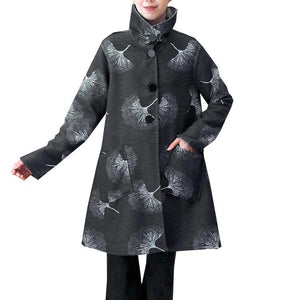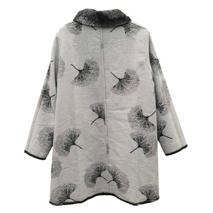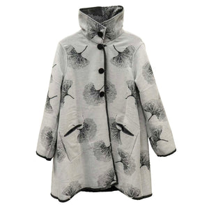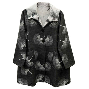 This beautiful sweater coat with a ginkgo brocade-like pattern has two side pockets and is reversible which gives two completely different looks in one coat. A distinctive layering garment, it is unstructured and has a soft cashmere like feel. Comes complete with a roll down collar. This versatile and chic coat effortlessly blends comfort and fashionable design, allowing you to switch between classic and modern aesthetics with ease. Made with premium materials, it is designed to keep you warm and confident, whether at work or enjoying a weekend stroll. Crafted from 85% Poly 15% Cotton. Hand wash or dry clean only.