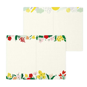 Yuru Log is a new notebook series developed so that anyone can easily relax, have fun, and continue writing their daily records. Each page of the dot grid has illustrations to add color to your records. Combined with Yuru Log series notebook covers and stickers, it is a notebook that makes writing and looking back even more enjoyable.  Through playful use of soft colors and childlike imagery, the Yuru Log turns each blank page from an intimidating challenge into a warm, judgment-free invitation. This notebook features a charming patterned textile motif with fun artwork on every page. The cover has a linen-like texture, and the pages are made of high-quality Midori MD Paper, which pairs effortlessly with pens and pencils of all kinds. The pages have a dot grid sheet style, and every two-page spread has one of four designs: Interiors, Greenery, Flower Field, and Weather. Comes complete with 80 pages, PUR Binding, and in PP Cover. Measures 7.16 x 4.84 x .1 in.