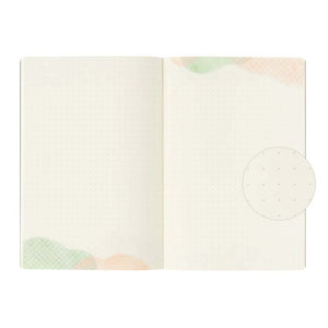 Yuru Log is a new notebook series developed so that anyone can easily relax, have fun, and continue writing their daily records. Each page of the dot grid has illustrations to add color to your records. Combined with Yuru Log series notebook covers and stickers, it is a notebook that makes writing and looking back even more enjoyable. The "Watercolor" design features soft illustrations with a watercolor touch in gentle tones, giving a soft impression. Each spread features a different design under four different themes, "Checks and Spring Patterns," "Soft Air," "Summer Seeds," and "Petals and Water Drops". Comes complete with 80 pages, PUR Binding, and in PP Cover. Measures 7.16 x 4.84 x .1 in.