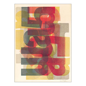 San Francisco–based printer Jack Stauffacher’s (1920–2017) bold experiments in letterpress expanded the ideas of wood type’s formal possibilities. Born in San Mateo, California, Stauffacher began his study of printing at the age of 16 and went on to design and print outstanding books for 80 years. He was the owner and operator of Greenwood Press, located in the San Francisco Bay Area. After receiving a box of discarded wood type in 1966, Stauffacher began playing with the mismatched letterforms as a break from his daily work. His resulting typographic experiments, often featuring bold layers of letters in black, bright blue or red, are a testament to type’s more expressive capabilities. Stauffacher’s refined yet graphic sensibility brought him acclaim in the worlds of both traditional fine printing and modern art. Examples of his wood and metal type designs can be found in the San Francisco Museum of Modern Art and the Los Angeles County Museum of Art. This set of notecards and envelopes, each pair unique, displays Stauffacher’s abstract yet exquisite treatments of typography. Contains 20 unique notecards and envelopes. Each card measures 4 x 5.5 in.