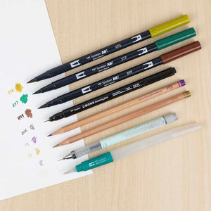 Bring your surroundings to life with the Urban Sketching Set, designed for artists who love capturing city views, small towns, and daily scenes. Each set includes 3 Dual Brush Pens, 2 Kimonogatari Colored Pencils, Medium Water Brush, MONO Graph Mechanical Pencil in Mint Green, MONO Drawing Pen in 005, and step-by-step digital guide. Dual Brush Pen Colors include: 076 Green Ochre, 277 Dark Green, 899 Redwood. Kimonogatari Colors Include: Gold and Violet.