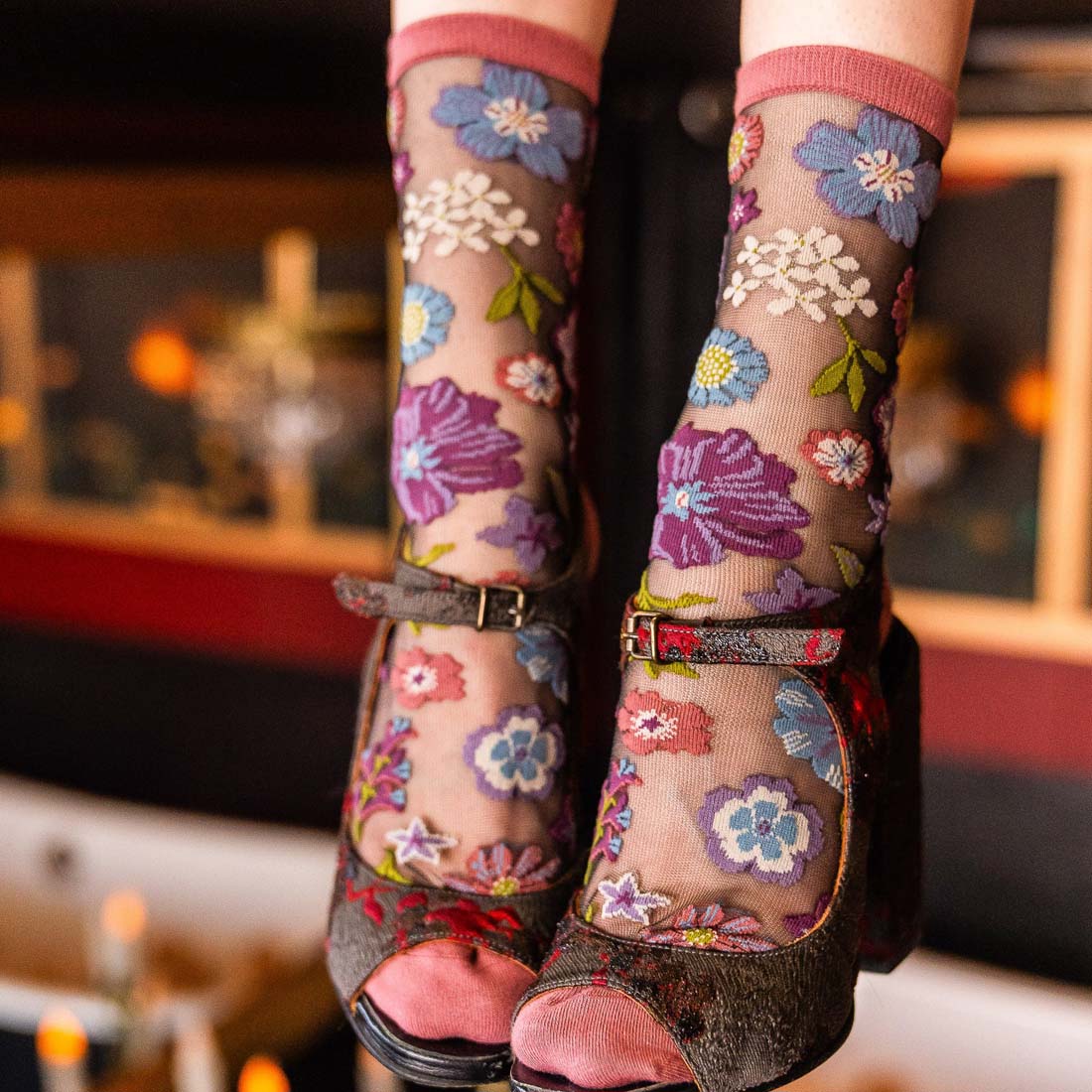 Romantic, vintage-inspired, and enchanting—the Dark Florals Black Sheer Sock is here to bring brooding beauty to your sock drawer. Featuring a cascade of garden blooms set against black sheer fabric in dusky purples, soft blues, sage greens, and ivory. Finished with a dusty rose cuff, heel and toe for an elegant touch. One size. Fits US women's shoe sizes 5.5-10.