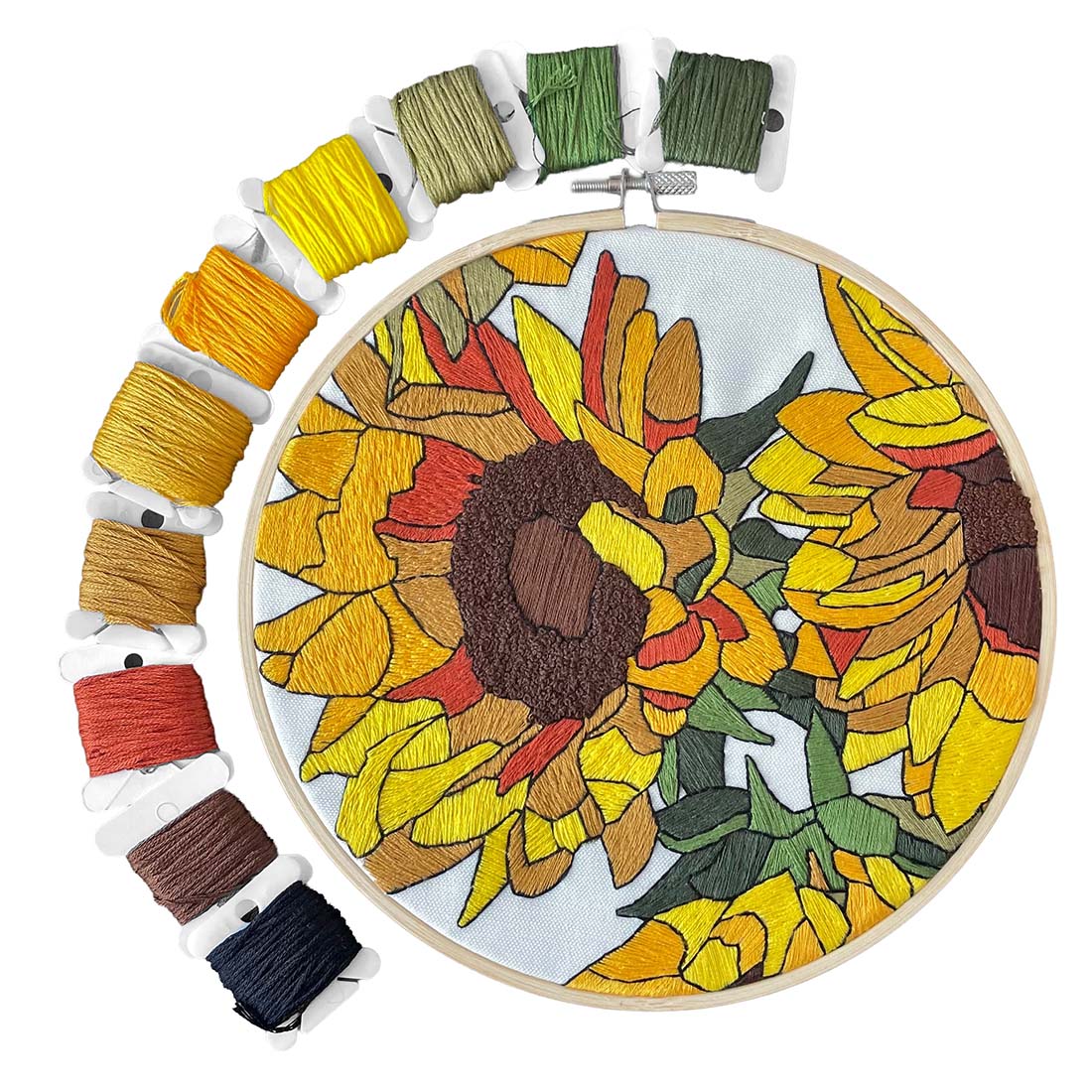 Bring a burst of sunshine to your stitching with this vibrant sunflower embroidery kit. The 8" design features 10 thoughtfully chosen DMC floss colors that capture the warm glow and intricate details of the sunflower’s petals and center. You will use four classic stitches—satin stitch, split stitch, French knots, and backstitch—to layer texture and depth, making the flower truly pop. The fabric comes pre-printed with the pattern, along with a clear color guide to keep you on track from start to finish. Perfect for both beginners and seasoned stitchers, the instructions offer friendly, step-by-step guidance that makes the process enjoyable and rewarding. Whether you are creating a cheerful gift or a bright addition to your own space, this kit brings the joy of summer into every stitch. Kit Includes: DMC embroidery floss (sorted on cards), pre-printed linen/canvas fabric, wooden hoop, embroidery needle, and full printed instructions. Ages 9 and up. Measures 8 in. completed.