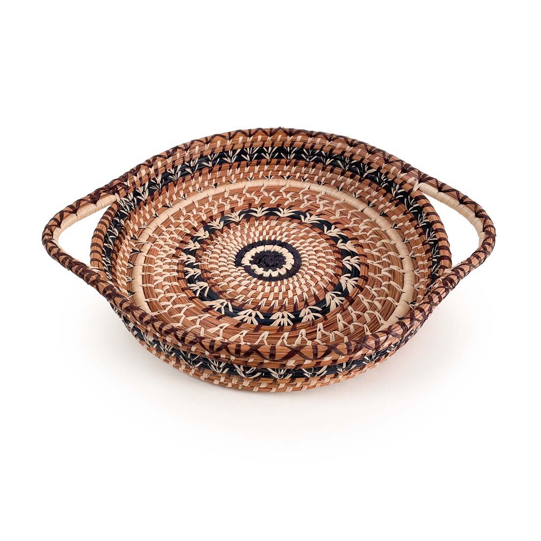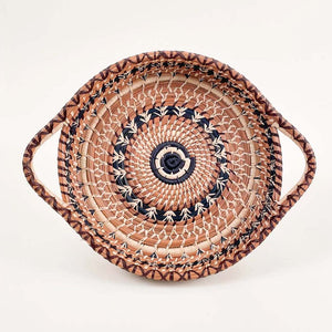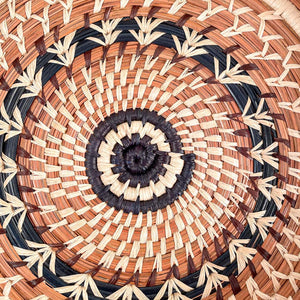 The Yolanda Basket was a prize winner in a Mayan Hands basket competition and is named for our artisan partner who designed it. Sustainably harvested longleaf pine needles are stitched with natural and indigo blue raffia. Lovely to display on a wall or to bring nature's texture to a tabletop. Native grass, pine needles, raffia. Fair-trade. Measures 10.5 x 13 x 2.25 in.
