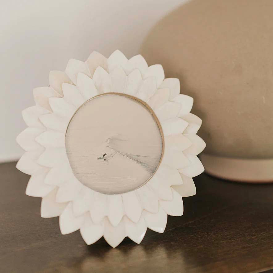 Handcrafted round photo frame features ethically sourced bone in a hand carved, 3D bloom design with a two-way table top easel and two d-rings for hanging. The picture frame accommodates 3x3 photo or print, easily accessed with metal swivel tabs and removable back. Holds 3 x 3 in. picture. Frame measures 5 x 5 in.