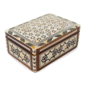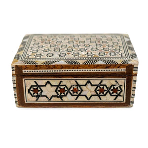 Handmade in the Khan al Khalili market of Egypt, this lovely wood box is made by craftsmen with extraordinary talent and patience. The shimmery mother-of-pearl is hand cut into different shapes and individually inlayed to create the geometric finished design of the lid. Taking several days to create, this lovely box is perfect to store jewelry and other treasures. Comes complete with a flip lid with fabric hinge and fabric cushioned interior. Spot clean interior with water and polish lightly with wood polish to restore luster, avoiding the mother-of-pearl design. Measure 5.25 x 3 x 3.5 in.