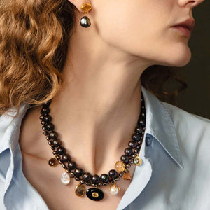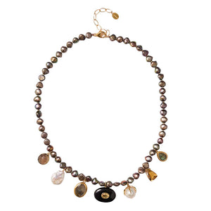 The deep, iridescent tones of this peacock pearl necklace are complemented by an assortment of hand-cut gemstone charms and white pearls. Anchoring the design is a smooth onyx stone with a bright citrine inlay. Chan Luu creates handmade jewelry, accessories and apparel for those who value high quality pieces and nature-inspired creation. Measures 17 - 19 in. adjustable.
